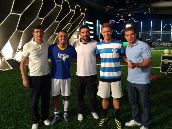 Foi muito legal gravar ontem, aqui em Buenos Aires, o programa Futebol 360, do canal Discovery. Obrigado a toda equipe brasileira pela atenção! Márcio (ficou fora da foto), Luciano, João, Bruno, eu e Túlio Maravilha, apresentador desta temporada do programa, na foto após o término das gravações. Valeu, amigos!