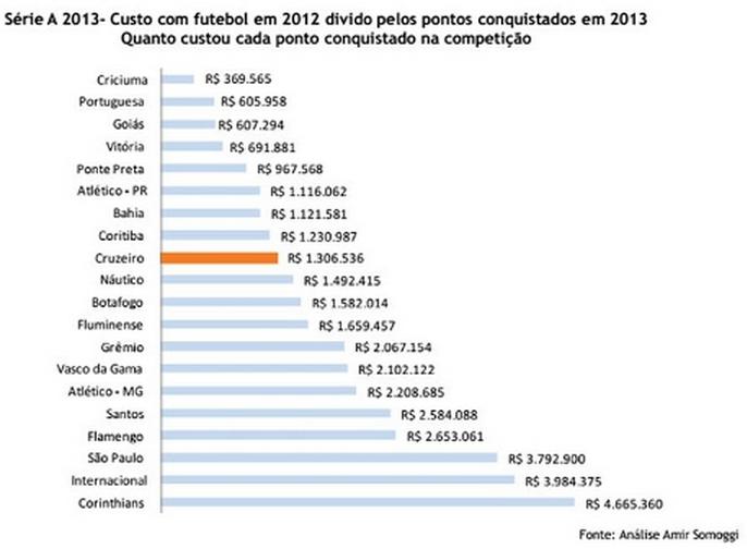 Ele levou em consideração o custo do futebol em 2012 de cada clube que disputou o campeonato deste ano. Somoggi dividiu o valor pelo número de pontos no Brasileirão.