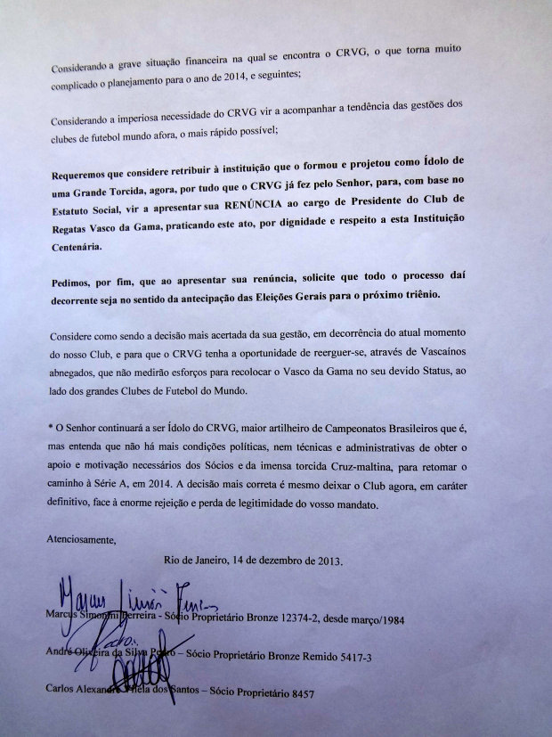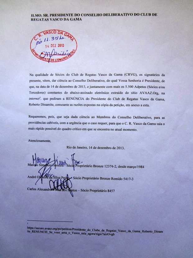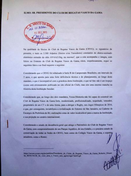 PETIÇÃO ESCRITA E APRESENTADA NA SECRETARIA DO CLUB DE REGATAS VASCO DA GAMA, EM 14/12/2013, CONTÉM A PETIÇÃO ELETRÔNICIA COM O ABAIXO-ASSINADO ELETRÔNICO PEDINDO A RENÚNCIA DO PRESIDENTE DINAMITE, COM MAIS DE 5590 ASSINATURAS!