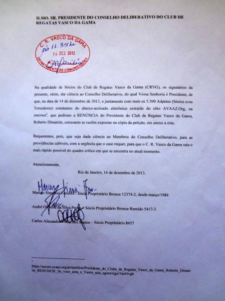 NO MESMO DIA 14/12/2013, TAMBÉM FOI APRESENTADA PETIÇÃO AO PRESIDENTE DO CONSELHO DELIBERATIVO (CD) DO CLUB DE REGATAS VASCO DA GAMA (Dr. Abílio Borges), DANDO CIÊNCIA AO CD QUE O PEDIDO DE RENÚNCIA DE DINAMITE FOI FORMALIZADO PELOS SÓCIOS E TORCEDORES DO GIGANTE DA COLINA!