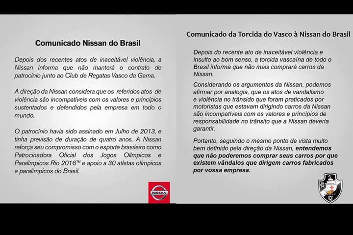A nota divulgada em nome da torcida do Vasco culpa a Nissan por "atos de vandalismo e violência no trânsito que foram praticados por motoristas que estavam dirigindo carros da Nissan" e diz que vascaínos não podem comprar carros da montadora.