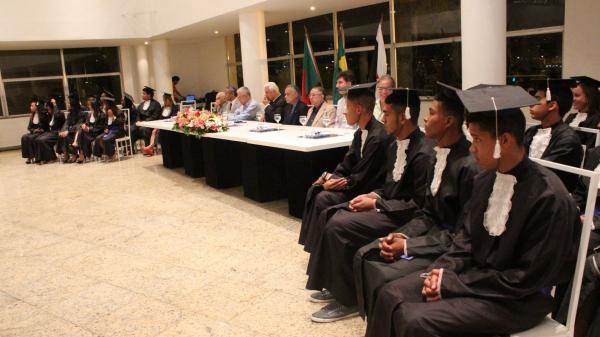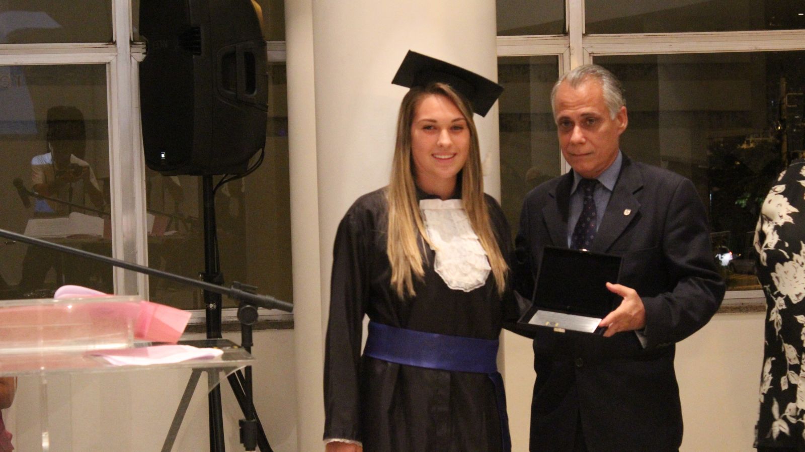 Em um segundo momento, as atenções voltaram-se aos alunos. Antes que todos os presentes recebessem seus diplomas, houve espaço para homenagear atletas do Colégio que foram campeões recentemente. Primeiro, jovens do atletismo, que ainda não se formaram, mas estavam no evento: Rafael Melo, campeão mundial escolar nos 100m com barreira, e Maria Vitória, campeã nacional escolar no salto em distância. Depois, três formandas, Bruna Luisa Bielski, Elaine Cristina da Silva, Carla Amorim Batista, que venceram, na semana passada, o campeonato escolar de futebol feminino.