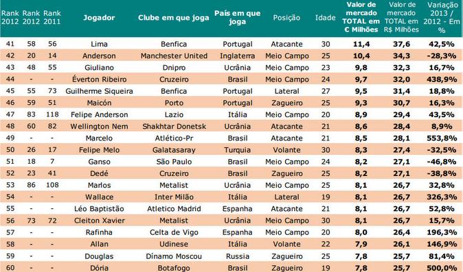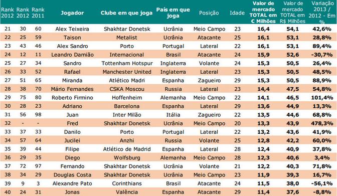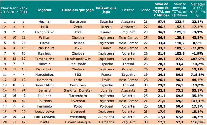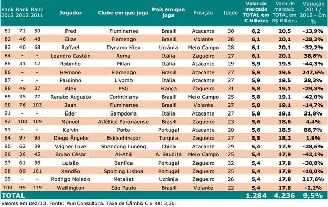 Uma avaliação feita pela Pluri Consultoria e divulgada na última 5ª-feira (19/12) relaciona os 100 jogadores brasileiros mais valiosos de 2013. Para conhecer os critérios utilizados na avaliação, acesse a íntegra do estudo clicando aqui.