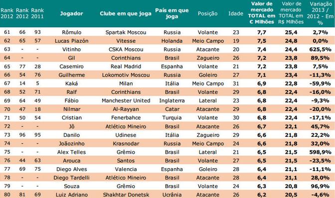 Cinco jogadores revelados pelo Vasco ou que tiveram parte de sua formação feita no clube integram o ranking: Philippe Coutinho (16º), Alex Teixeira (21º), Allan (58º), Romullo (61º) e Souza (79º). Juntos, eles têm valor de mercado de R$ 195,7 milhões.