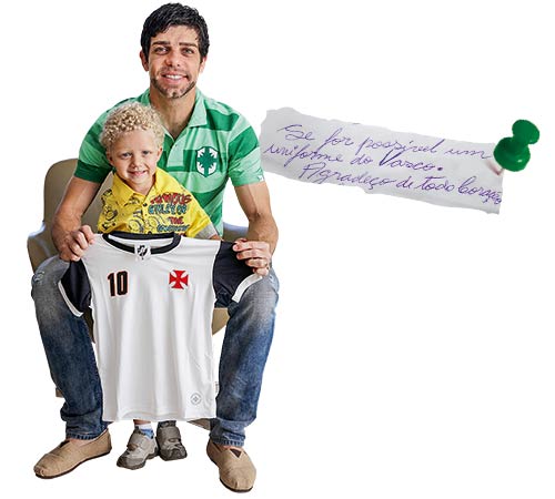 Foi uma amiga da mãe de Diogo Barros da Silva, 4 anos, quem deu a ideia quando o menino pediu um uniforme completo do Vasco: "Por que não escrever para o Papai Noel e colocar a carta no correio?". Quando a correspondência foi selecionada por VEJA RIO entre as centenas enviadas todos os dias às agências, nem a amiga nem a mãe, Anselma Oliveira, poderiam imaginar que o presente viria e, ainda por cima, seria dado pelo jogador Juninho Pernambucano, ídolo da torcida vascaína. Na data marcada, Diogo, Anselma e o pai, Djalma Barros da Silva, foram recebidos na casa do jogador com um bolo de chocolate. Ao craque, os pais contaram que são vascaínos doentes, que o sentimento não arrefeceu com o rebaixamento e recordaram a primeira palavra dita pelo menino, há dois anos. "Foi Vasco", disse Anselma, com as mãos tremendo. "Sou católico e dou va- lor ao Natal. Fico feliz por ter propiciado felicidade a uma família", afirmou Juninho.