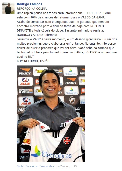 Uma rápida pausa nas férias para informar que RODRIGO CAETANO esta com 90% de chances de retornar para o VASCO DA GAMA.