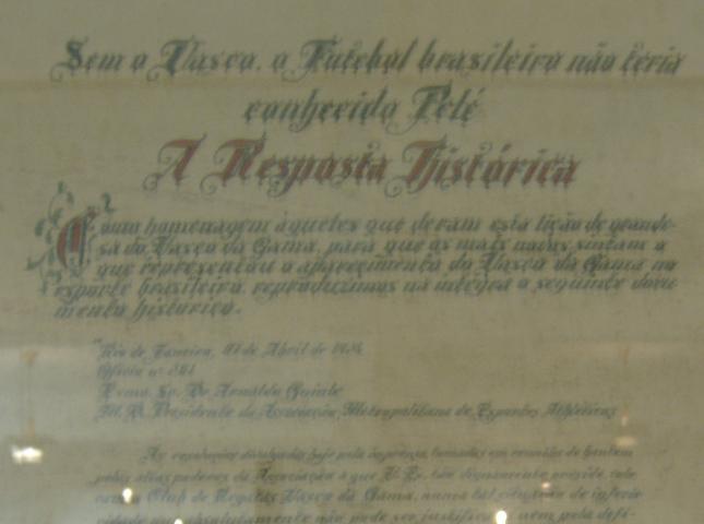 Uma reprodução da "RESPOSTA HISTÓRICA", este verdadeiro marco da luta do Club de Regatas Vasco da Gama contra a discriminação social e racial no esporte brasileiro, pode ser vista nos dias de hoje na Sala de Troféus da sede de São Januário, encimada pelo seguinte lembrete: "Sem o Vasco, o futebol brasileiro não teria conhecido Pelé".