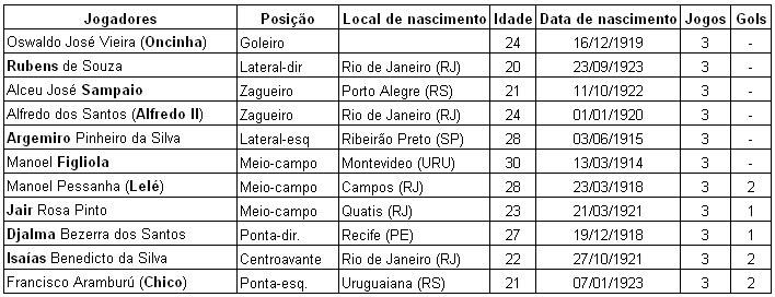 VASCO: Oncinha, Rubens, Sampaio; Alfredo II, Figliola, Argemiro; Djalma, Lelé, Isaias, Jair e Chico. Técnico: Ondino Viera.