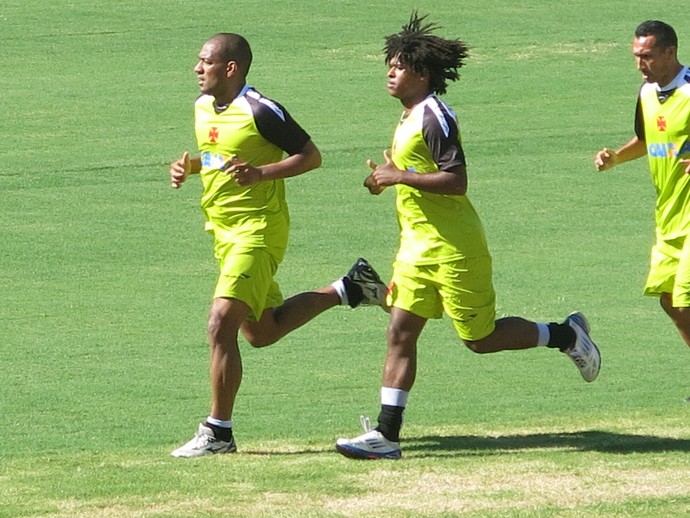 O segundo dia de treinos do Vasco em 2014 começou com mais três novidades para a torcida cruz-maltina. Depois de apresentar na última segunda-feira o goleiro Martín Silva, o volante Aranda e o diretor executivo Rodrigo Caetano, nesta terça foi a vez de acompanhar a primeira atividade em campo do trio formado pelo zagueiro Rodrigo, ex-Goiás, e os laterais André Rocha e Marlon, contratados junto a Figueirense e Criciúma, respectivamente. Os jogadores realizaram um trabalho físico sob a supervisão do preparador Daniel Gonçalves. O restante do elenco trabalhou na academia do clube.