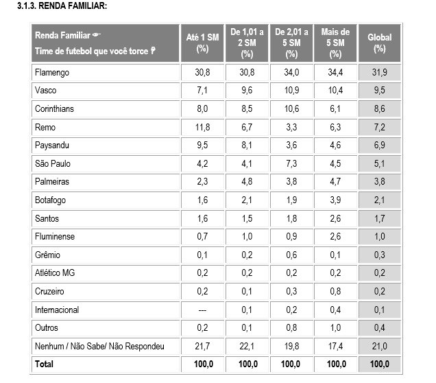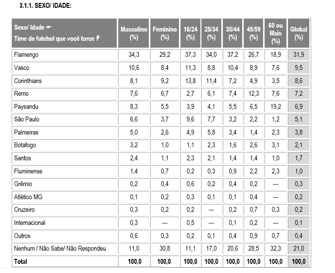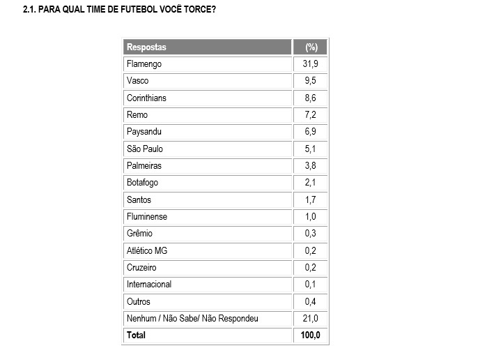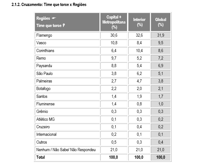Por ora, nada mudou com relação ao que sempre foi verificado. O Flamengo detém a maior torcida com larga margem (31,9%) e viés de alta. Isto significa que, no futuro, haverá ainda mais rubro-negros em sua região de maior predominância. A segunda maior torcida é a do Vasco (9,5%), seguido de perto pelo Corinthians (8,6%). Beneficiados pela grande população paraense (48% do total da região Norte), Remo (7,2%) e Paysandu (6,9%) fazem bonito. Em seguida estão São Paulo (5,1%), Palmeiras (3,8%), Botafogo (2,1%), Santos (1,7%) e Fluminense (1%).