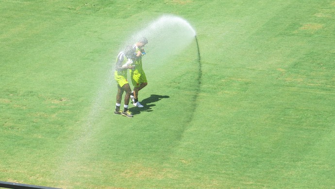O volante Fellipe Bastos, os zagueiros Rodrigo, Jomar e Kadu Fernandes e o atacante Reginaldo aproveitaram a fonte de água para aliviar o calor. O último, aliás, chegou a colocar a cara no jato d'água sem proteger o rosto com as mãos e saiu até meio tonto. O elenco volta a treinar pela tarde no CFZ, no Recreio, antes de viajar para Pinheiral, local da pré-temporada.