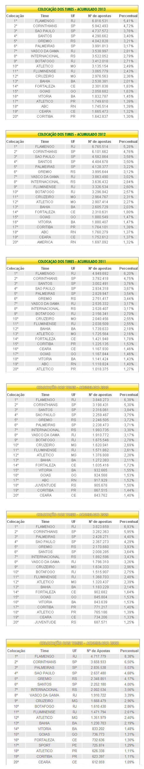 Apostas no Vasco na Timemania por anos, 2008-2013