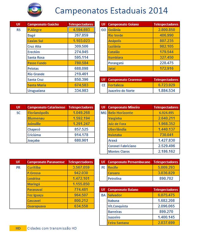 Serão televisionados os campeonatos Gaúcho, Catarinense, Paranaense, Paulista, Carioca, Mineiro, Goiano, Pernambucano, Cearense, Baiano, Mato-grossense e Sul-Matogrossense. Ceará, Bahia e Pernambuco podem revezar seus torneios com a Copa do Nordeste. Os demais estados (quinze no total) assistirão ao campeonato do Rio de Janeiro. Pela primeira vez o DF alternará entre os campeonatos Paulista e Carioca. Em compensação, os torneios de MT e MS, que revezavam com o Paulistão, serão transmitidos na íntegra.