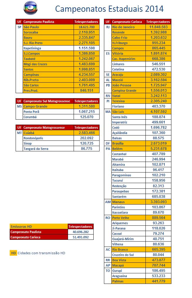 Entre os principais estados, os campeões do HD são Paraná (10.310.798 telespectadores) e Rio de Janeiro (16.265.882 telespectadores): 100% deles captam sinais em alta definição. Goiás (5.905.565), Pernambuco (8.936.824) e São Paulo (41.847.880) possuem apenas uma afiliada com distribuição de sinais de menor resolução.