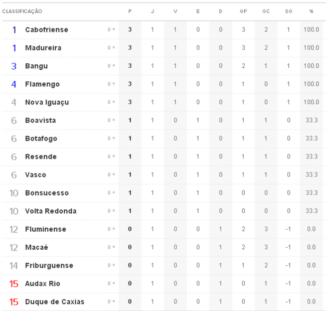 Terminada a 1ª rodada do Campeonato Estadual, o Vasco, que empatou com o Boavista por 1 a 1, iniciou a competição na 6ª colocação empatado com outros 3 clubes em todos os critérios de desempate.