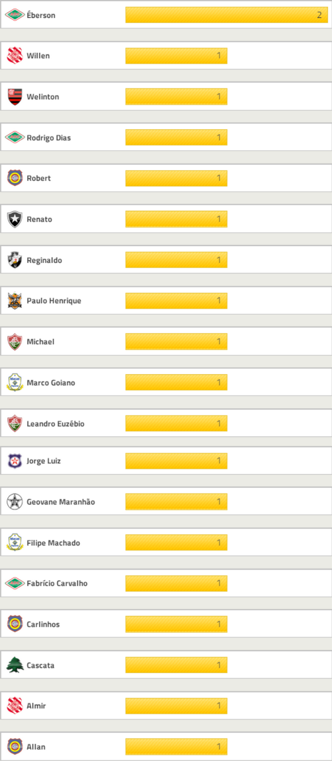 Reginaldo, autor do único gol do Vasco, se junta a 17 outros jogadores na 2ª colocação entre os artilheiros. Éberson, da Cabofriente, é o goleador máximo da competição com 2 gols.