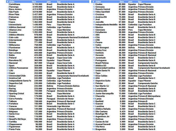 Os grandes clubes brasileiros têm, ainda, muito espaço para crescer. Não acredito, porém, que chegarão sequer perto da marca do United e repetirão, com números um pouco maiores, as marcas dos grandes times da Turquia (lembrando que o Besiktas é o 18º). Fernando Martinho pensa de forma parecida, destacando que os grandes times sul-americanos, e também os mexicanos, manterão boa briga com os europeus do segundo escalão. Pessoalmente, acredito que em alguns anos veremos a chegada de times dos Estados Unidos, alargando e apimentando a disputa. Essas perspectivas de crescimento e disputa são baseadas muito mais nos tamanhos das populações do Brasil, Argentina, México, Colômbia e Peru, que, bem ou mal, mais rapidamente ou mais lentamente (como entre nós), vão entrando na vida digital, do que nas economias desses países e, principalmente, na distribuição de renda entre seus habitantes (e o caso mais grave adivinhem qual é?). veremos, agora, a lista dos Top 100 Sul-Americanos, fechando esse post.