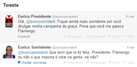 A versão mais "light" de Eurico Miranda em sua campanha à presidência do Vasco, além de despertar comentários entre os vascaínos, ganhou uma sátira no Twitter. O perfil "Eurico Sorridente" (@euricosorrident) brinca com a nova postura do atual presidente do Conselho de Beneméritos do Vasco e chega até mesmo a interagir com o perfil oficial da candidatura (@euricopresident), como se pode ver na imagem abaixo.