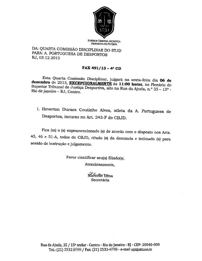 O e-mail com o aviso do julgamento chegou para a presidência da Lusa e foi encaminhado para os departamentos jurídico e de futebol. O advogado Osvaldo Sestário recebeu este e-mail, tanto que defendeu Héverton no STJD, na sessão de 6 de dezembro.