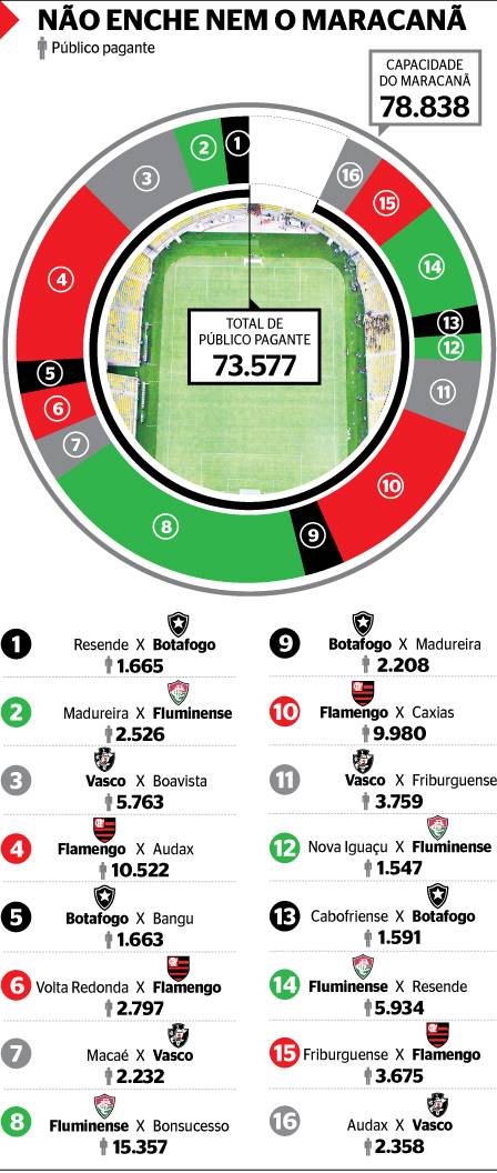 O Estadual também é um fracasso de público. Pouco mais de 73 mil pessoas pagaram ingressos para ver as partidas do quatro grandes do Rio, número insuficiente sequer para lotar o Maracanã, que pode receber até 78 mil torcedores atualmente.