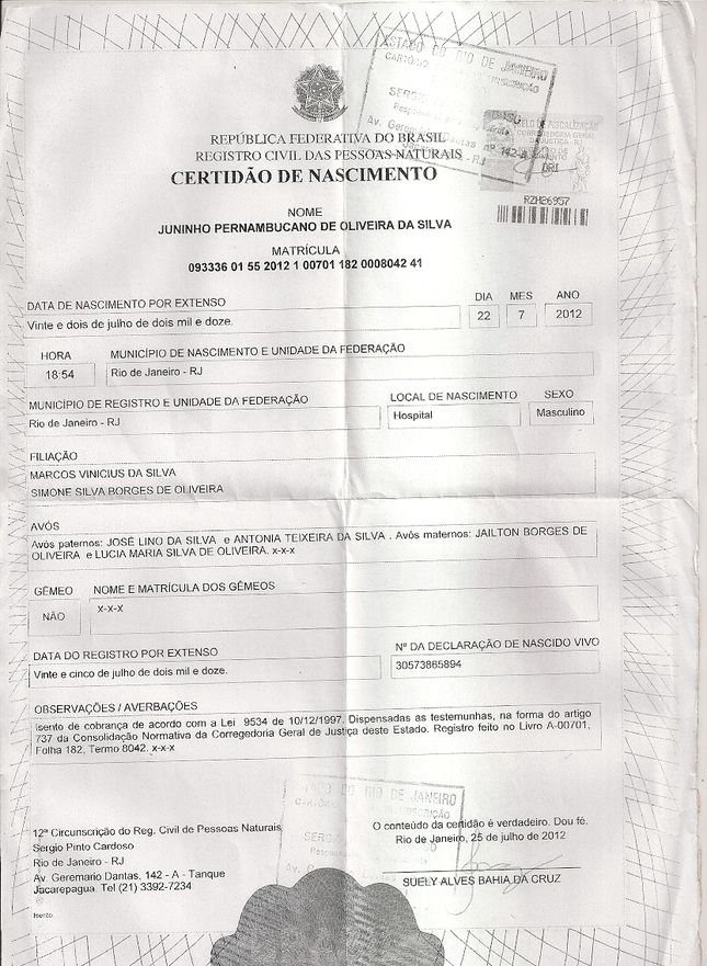 Morador de Jacarepaguá e autônomo, o pai de Juninho Pernambucano trabalha como ambulante ao lado da esposa, Simone Oliveira, também de 37 anos, que, à princípio, não gostou do nome, mas aceitou as escolhas do patriarca da família.