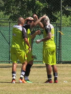 Mas a cena mais engraçada da ação ficou por conta do atacante William Barbio. Por causa de seu cabelo diferente, o jogador logo virou alvo dos companheiros. E chegou a sair correndo do gramado enquanto era perseguido por outros três jogadores.