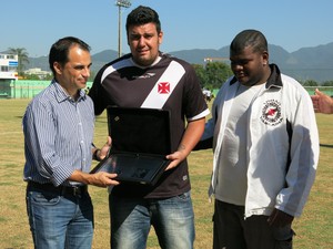 O diretor executivo de futebol Rodrigo Caetano ganhou um presente neste sábado. O homem forte do futebol do Vasco foi homenageado por uma das organizadas do Cruz-Maltino. Dois integrantes da torcida União Vascaína foram ao treinamento no CFZ e entregaram uma placa ao dirigente por seus serviços prestados ao clube de São Januário.