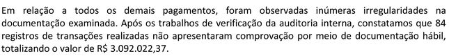 Também: saldos incorretos nos registros de dívidas com os fornecedores Locaflat e Lumaram, Irregularidades como contratos referentes ao CT Itaguaí; Irregularidades na execução do contrato referente ao Programa de Sócios.