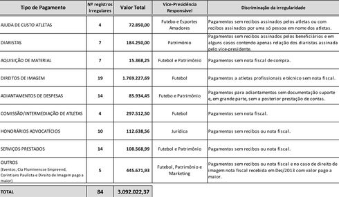 Há falta de nota fiscal desde o pagamento do direito de imagem a 17 atletas, somando, assim, R$ 1.769.227,69, até o pagamento de diaristas, somando total de R$ 184.250,00. A comissão/intermediação de quatro atletas também não tem comprovação fiscal. O valor chega a R$ 297.512..