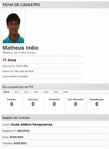 07/01/2014- Matheus Índio é registrado na Federação Paulista de Futebol como jogador da Penapolense.