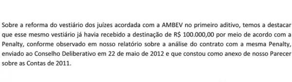 "Sobre a reforma do vestiários dos juízes acordada com a Ambev no primeiro aditivo, temos a destacar que este mesmo vestiário já havia recebido a destinação de R$ 100.000,00 por meio de acordo com a Penalty, conforme observado em nosso relatório sobre a análise do contrato com a mesma Penalty, enviado ao Conselho Deliberativo em 22 de maio de 2012 e que constou como anexo de nosso parecer sobre as contas de 2011".