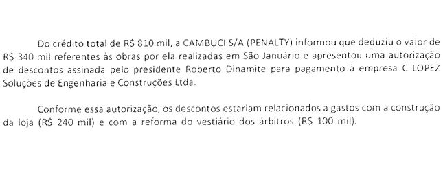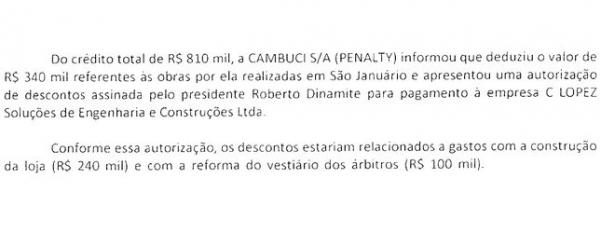 Este valor é justamente o que foi descontado na prestação de contas de 2011 pela Penalty, com a justificativa de ter feito a reforma do vestiário dos árbitros. Mas no balanço de 2012, também aparecem o mesmo desconto e a justificativa, desta vez em favor da Ambev. Só que os membros do Conselho Fiscal não deixaram o "deslize" passar em branco.