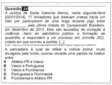A briga entre torcedores de Vasco e Atlético-PR na Arena Joinville (SC), ocorrida em 8 de dezembro do ano passado, durante jogo do Campeonato Brasileiro, virou questão de conhecimentos gerais do concurso para agente de serviços administrativos da Câmara Municipal de Jundiaí (SP). A prova foi aplicada no dia 2 de fevereiro.