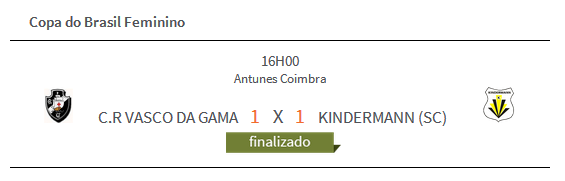 No jogo de ida das oitavas-de-final da Copa do Brasil de Futebol Feminino, o Vasco empatou com o Kindermann-SC por 1 a 1 na tarde desta 5ª-feira (13/02) no Estádio Antunes Coimbra, do CFZ. A partida de volta será disputada na próxima 4ª-feira (19/02), às 20h30, em Fraiburgo (SC).