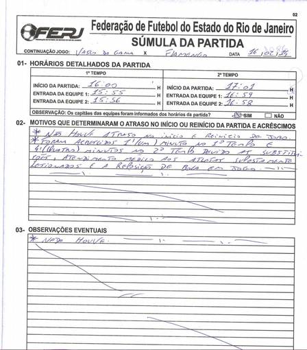 “Não houve atraso no início e reinício de jogo. Foram acrescidos um minuto no 1º tempo e quatro no 2º tempo devido às substituições, atendimento médico aos atletas supostamente lesionados e reposição de bola em jogo”, escreveu o juiz Guimarães.