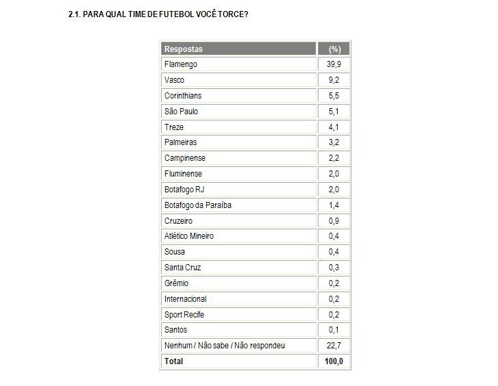 O Flamengo, com sempre, é hegemônico: detem quatro de cada dez torcedores paraibanos – ou precisamente 39,9%. Em segundo vem o Vasco, com 9,2%, sucedido pelo empate técnico entre Corinthians (5,5%) e São Paulo (5,1%). A partir daí surgem boas surpresas locais, como o Treze de Campina Grande (4,1%), maior torcida entre os clubes da Paraíba. Depois temos Palmeiras (3,2%) e Campinense (2,2%), outro representante da maior cidade do interior. Fluminense e Botafogo marcam 2%, enquanto o Botafogo da Paraíba atinge 1,4%.