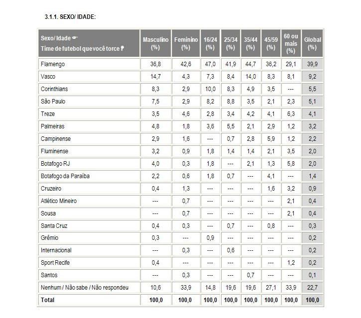 Por idade, percebe-se liderança rubro-negra cada vez maior: 47% daqueles entre 16 e 24 anos – faixa em que Corinthians (10%) e São Paulo (8,2%) ultrapassam o Vasco (7,3%). Treze, Fluminense e Botafogo são maiores entre pessoas acima de 60 anos.