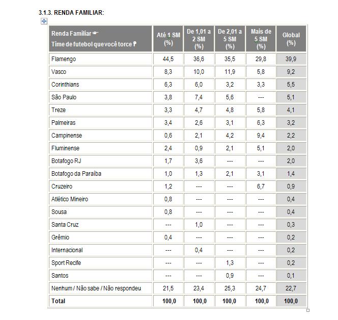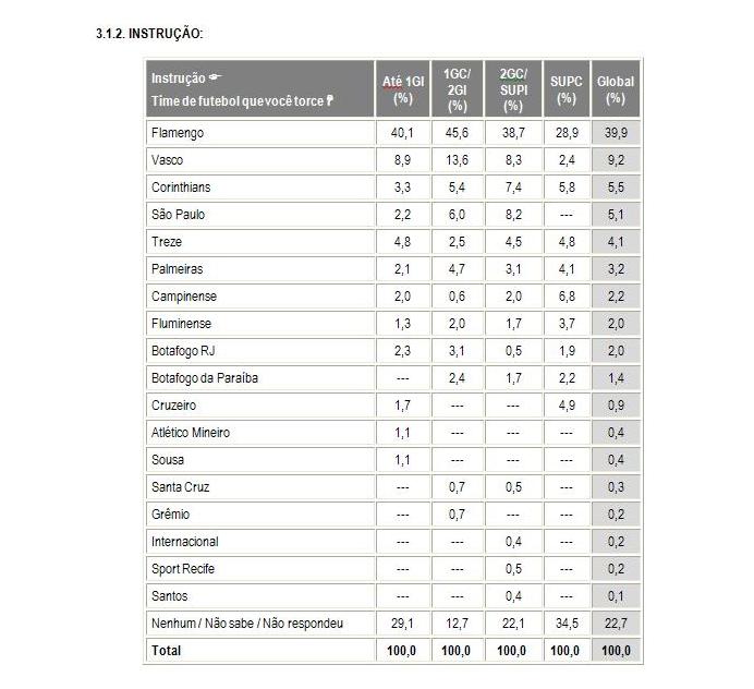 Por instrução, a presença de flamenguistas (28,9%) e vascaínos (2,4%) diminui entre aqueles com nível universitário. Campinense (6,8%) e até mesmo Cruzeiro (4,9%) foram bem entre pessoas com mais estudo. O mesmo se verifica no tocante à renda, já que surpreendentemente o Campinense surge como segunda torcida mais rica da Paraíba (9,4%).