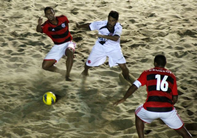 Se o Botafogo x Fluminense foi nervoso... Com arquibancadas divididas, Flamengo x Vasco da Gama prometia ser um ‘teste para cardíaco’. Bueno fez a metade cruzmaltina comemorar primeiro, completando de cabeça para o fundo do gol: 1 a 0. Também usando a cabeça, o rubro-negro Michael deixou tudo igual. Boas jogadas, lances de perigo, clássico pegava fogo e Mauricinho resolveu aparecer. Duas vezes. Acertou um belo chute para colocar o ‘Trem-Bala da Areia’ na frente novamente. E abusou da categoria para vencer William e aumentar: 3 a 1, placar do primeiro período.