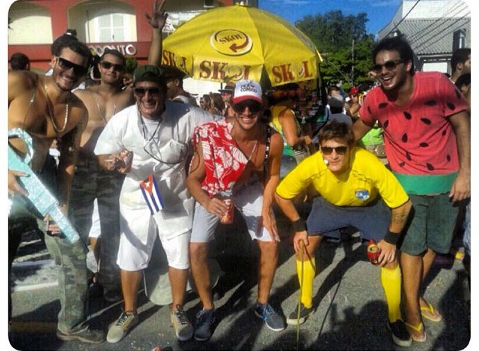 ![]() Nathan Coelho vestido de Rodrigo Castanheira ao lado de amigos em Volta Redonda |