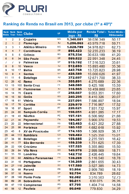 Levantamento feito pela Pluri Consultoria revelou que o Vasco foi 8º clube brasileiro em arrecadação no ano de 2013. A íntegra do estudo pode ser acessada neste link.