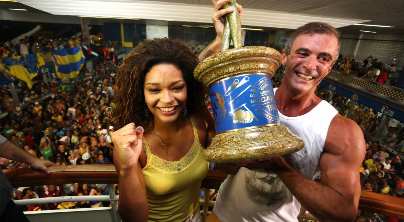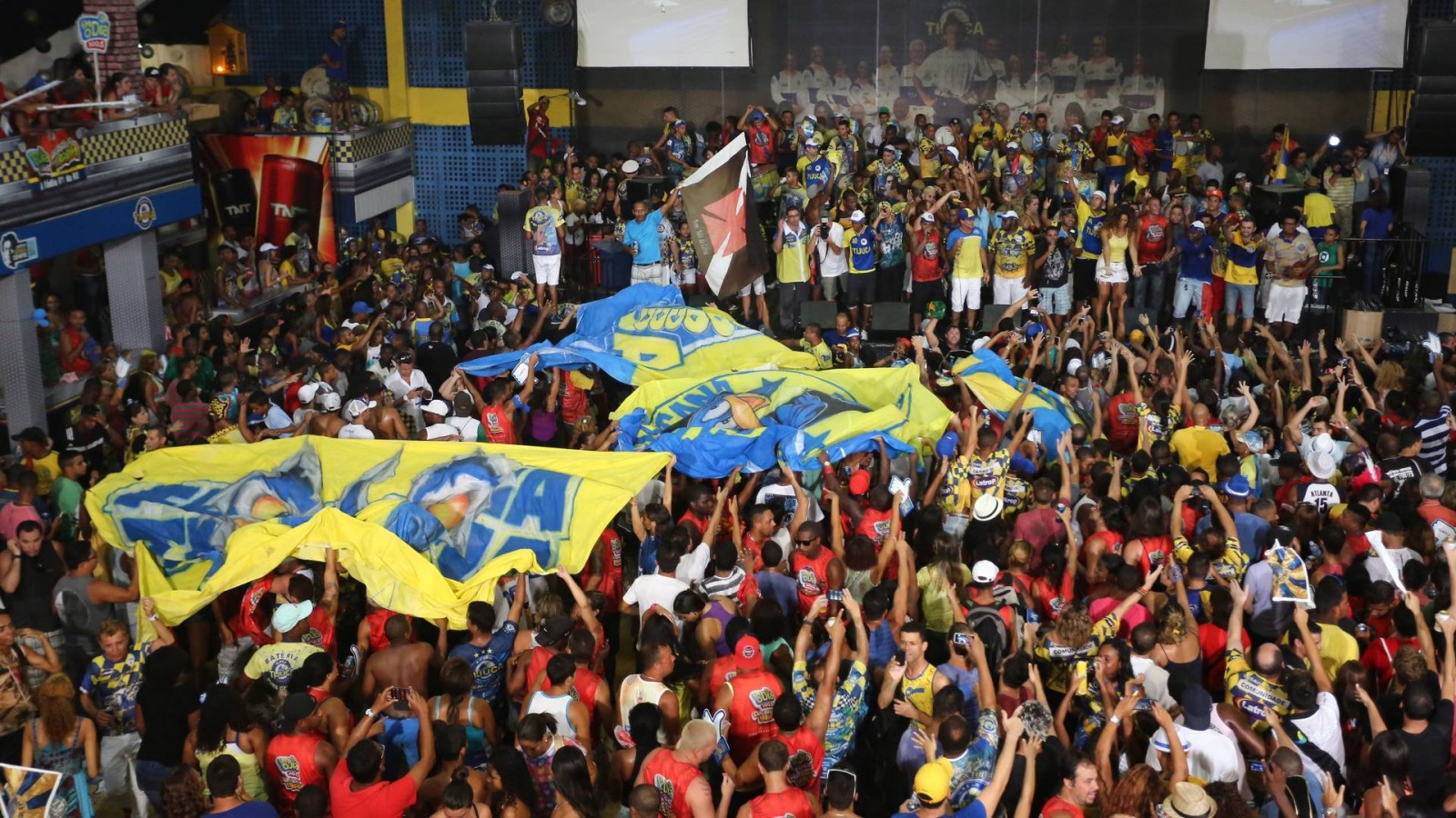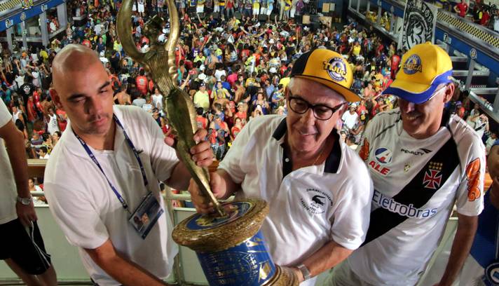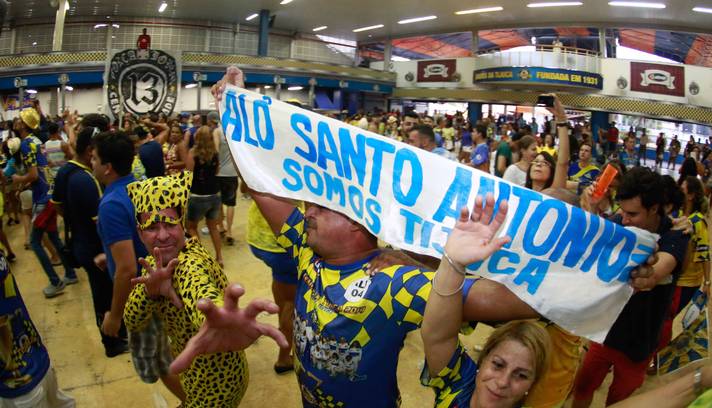 Como em outras comemorações de título, várias camisas e bandeiras vascaínas podem ser vistas na quadra da Unidos da Tijuca.