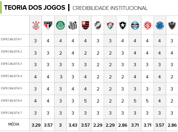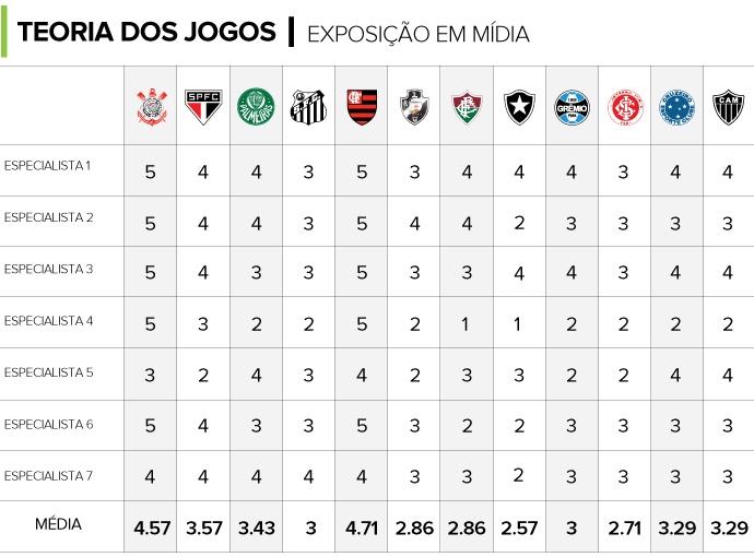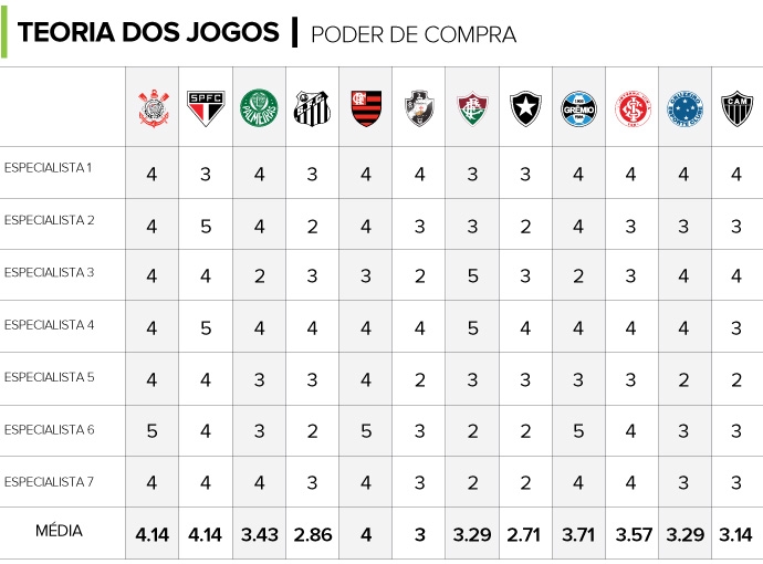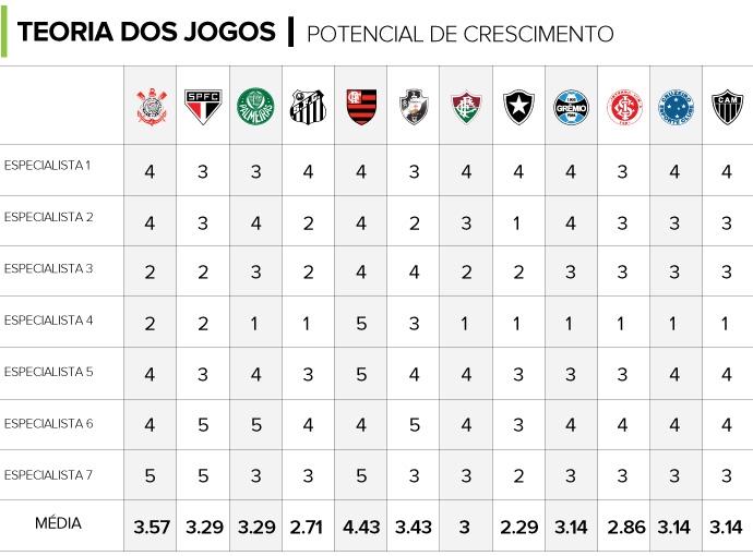 Assim como em 2013, o Flamengo é o líder (4,43) com nota muito superior à concorrência. O Corinthians segue em segundo (3,57) e o Vasco é terceiro (3,43 - mesma nota do ano passado). É possível que a péssima situação cruzmaltina faça especialistas considerarem que o pior tenha passado, havendo margem para reverter a estagnação verificada no tamanho da torcida e nível de receitas. Em direção o oposta, o Santos desabou de 3º para 11º (nota 2,71), fenômeno que deve ser atribuído ao fim da “era Neymar” e às incertezas que rondam o balneário.