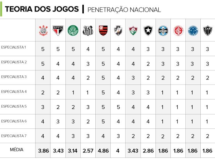 Não custa repetir que o ordenamento deve ser interpretado como o ranking das marcas mais valiosas do futebol brasileiro segundo percepção pontual dos especialistas. Já as notas seriam um número-índice da proporcionalidade entre os clubes. Sendo assim, um aporte hipotético de R$ 42,7 milhões ao Flamengo equivaleria ao valor de R$ 39,6 milhões pela camisa do Corinthians, R$ 35,7 milhões ao São Paulo e assim sucessivamente.