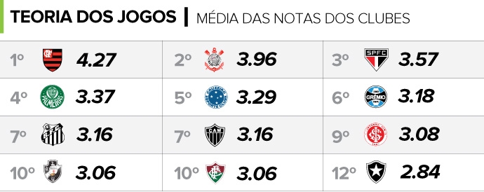 O sexto foi o Grêmio (3,18), seguido pelo Santos (3,16) – outrora em quarto. O Galo saiu de último para sétimo (3,16), empatado com o alvinegro praiano. O Internacional foi a nono (3,08) havendo empate entre Vasco e Fluminense no décimo posto (3,06). A propósito, vascaínos e tricolores tiveram a pior queda, pois apareceram em sexto e quinto ano passado. Por fim, o Botafogo (2,84) dá a entender que a liderança rubro-negra é uma ilha num contexto de pouco valor atribuído aos cariocas.