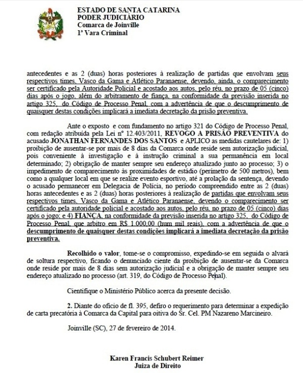 No documento de expedição de soltura de Jonathan, a juíza da 1ª Vara Criminal de Joinville, Karen Francis Schubert Reimer, destacou que houve uma nova análise dos vídeos da confusão: "reavaliando os vídeos que constam nos autos, observo que a conduta do referido denunciado parece não ter extrapolado os limites da norma penal."