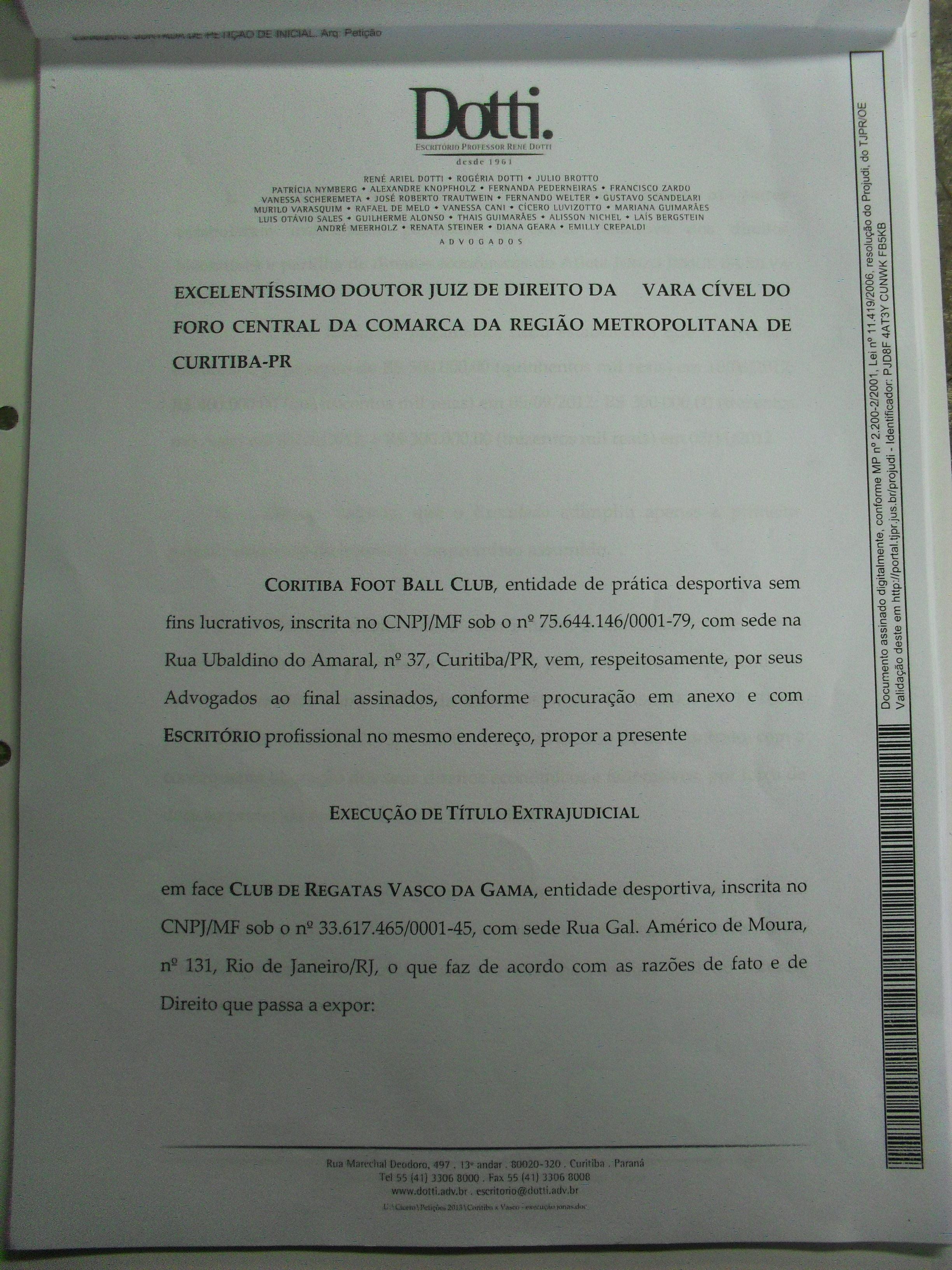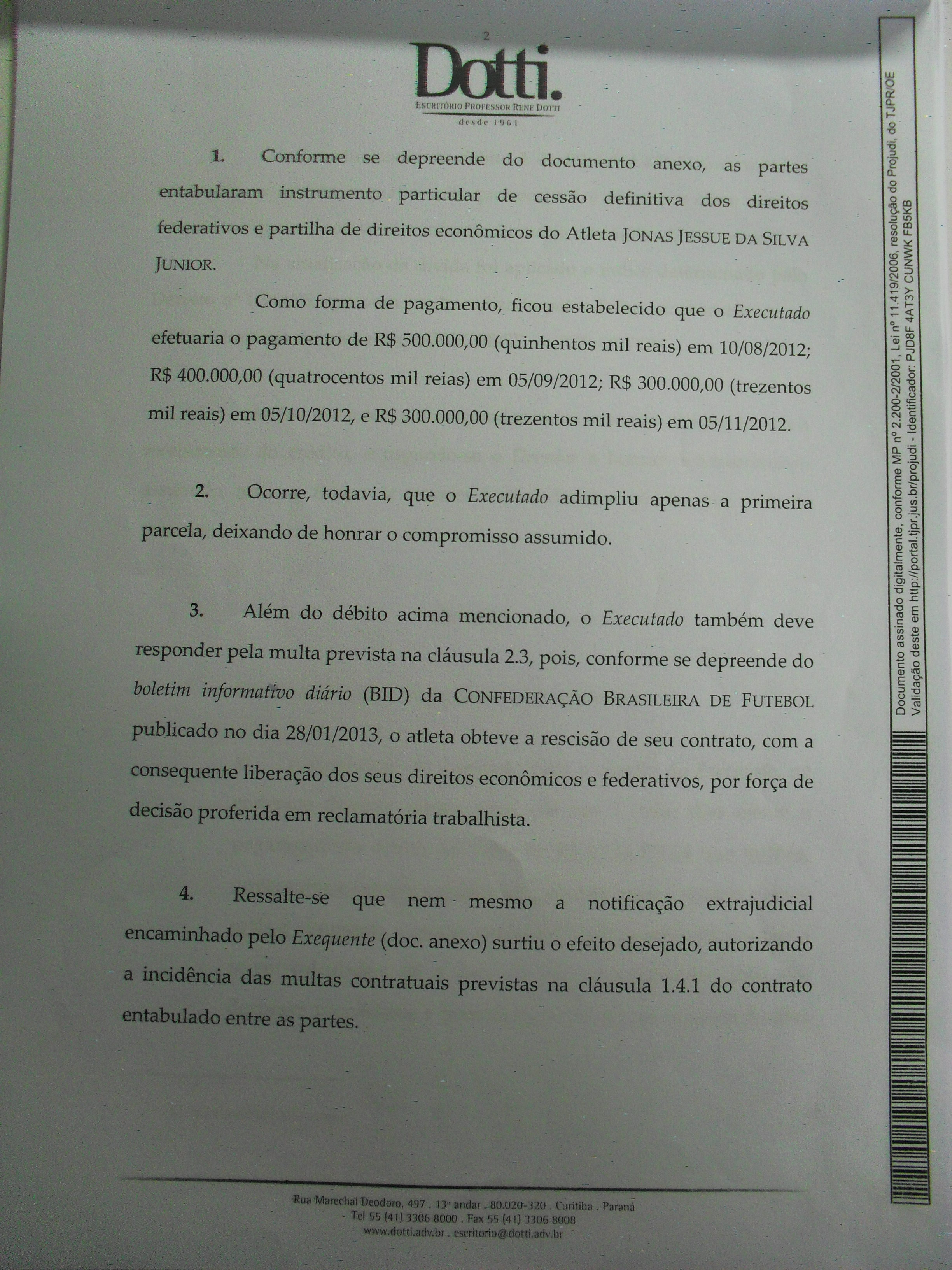 Ou seja, o Vasco teria dado calote no Coritiba em 700 mil reais, o clube paranaense cobra hoje mais de 1,9 milhões de reais, por descumprimento de cláusulas contratuais, enquanto o atleta Jonas está na Justiça cobrando do Vasco mais de 5 milhões de reais, porque o clube assinou um contrato de três anos com ele, não pagou salários ainda em 2012, foi acionado na Justiça em função do débito ultrapassar três meses, e agora se vê nesta situação.