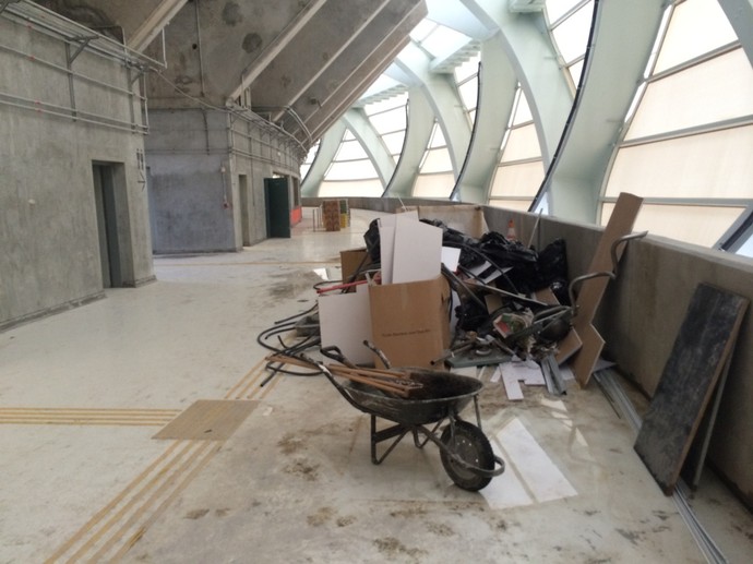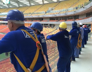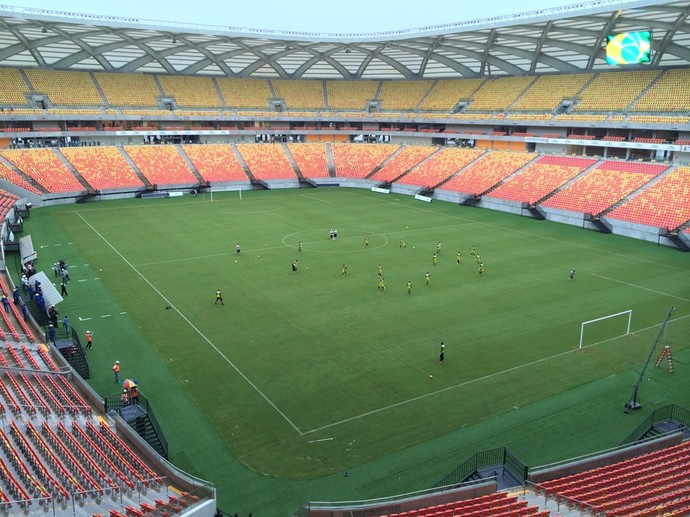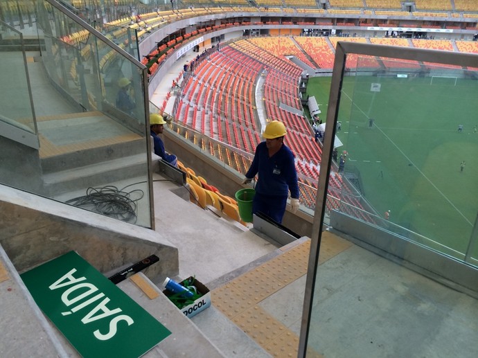 Durante todo o dia, funcionários da empresa responsável pela construção trabalharam nos últimos detalhes. O foco principal foi voltado para as arquibancadas superiores, que serão abertas ao público pela primeira vez. Apesar do ritmo intenso do trabalho, no fim da tarde ainda era possível encontrar muitos vestígios de obra no anel superior do estádio. Tudo deve ser retirado até a manhã desta quinta-feira, quando a Arena da Amazônia passará por uma limpeza geral.