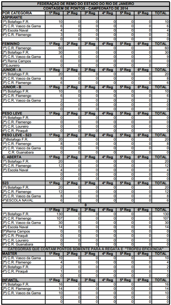 O Vasco lidera a disputa em uma das 10 categorias, a Master. São 10 pontos vascaínos contra 4 do Flamengo e 2 do Botafogo. O Alvinegro lidera em 9 categorias e, o Flamengo, em uma. A categoria Master, no entanto, não conta pontos para o Estadual.