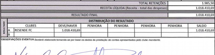 Segundo o borderô publicado no site da CBF, a renda líquida do confronto foi de R$ 1.018.410,69. O documento destina esse valor ao Resende, mandante do jogo. O clube do Sul Fluminense, no entanto, recebeu um valor fixo - não revelado por sua diretoria - por levar a partida para Manaus e a renda milionária, segundo o Vasco, ficou com os organizadores do evento.